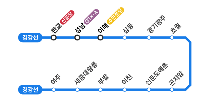 ✅️ 경강선은 성남시 판교역에서 출발해 여주시 여주역까지 연결되는 수도권 광역철도 노선입니다.