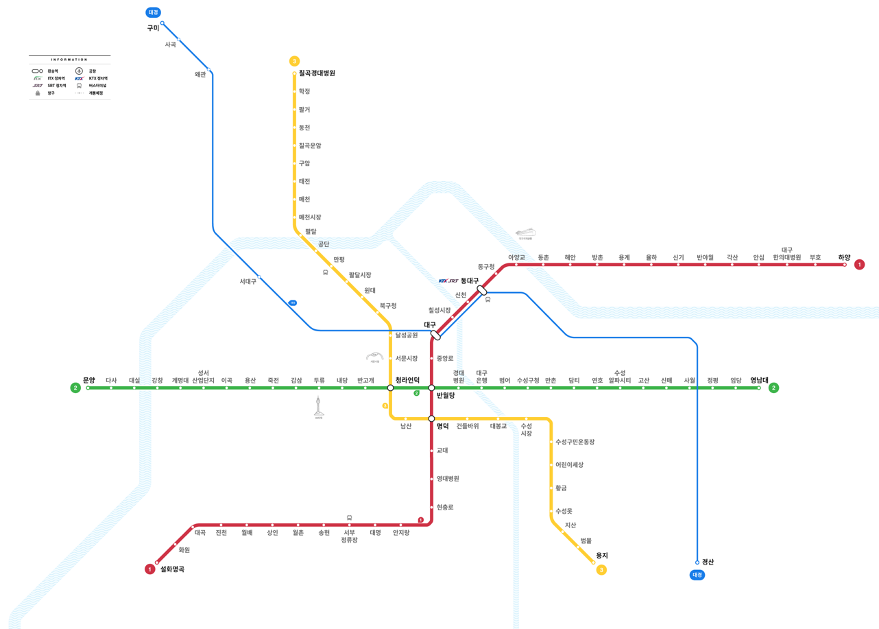 ✅️ 대구 지하철은 시내 주요 상권과 대학가, 관광지를 빠르게 연결해주는 도시철도로, 광역철도인 대경선을 함께 이용하면 구미, 경산 등 외곽 지역까지도 손쉽게 접근할 수 있어 활용도가 매우 높습니다.