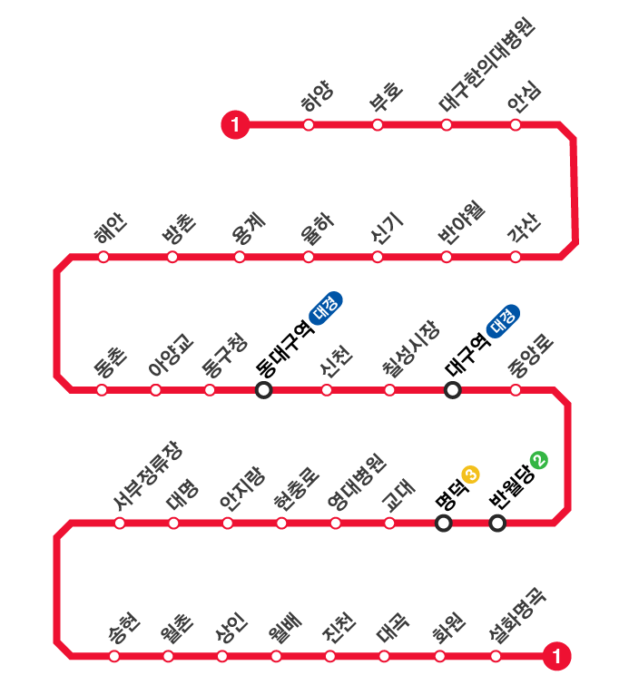 ✅️ 대구 지하철 1호선은 설화명곡역에서 안심역까지 이어지는 대구 도시철도의 대표 노선으로, 총 연장 약 28.4km에 달하는 구간을 운행하며 도심과 외곽을 고르게 연결하는 중요한 역할을 하고 있습니다.