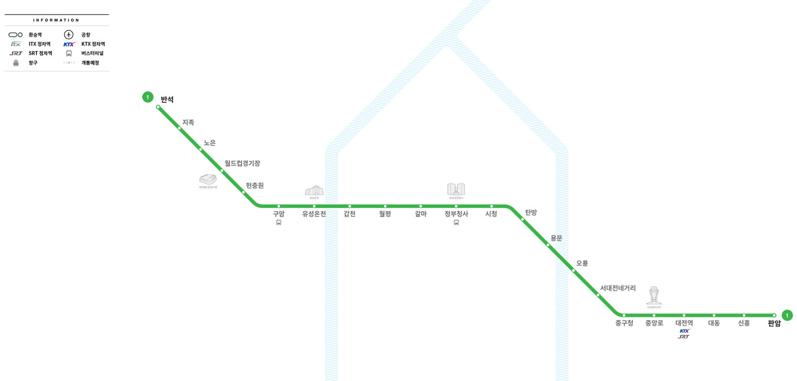 1호선은 단순한 구조지만 대전역, 시청, 대전시교육청, 충남대, 갤러리아 타임월드 등 주요 지역을 지나며 시민들의 일상적인 통근·통학, 업무 이동을 책임지고 있습니다.