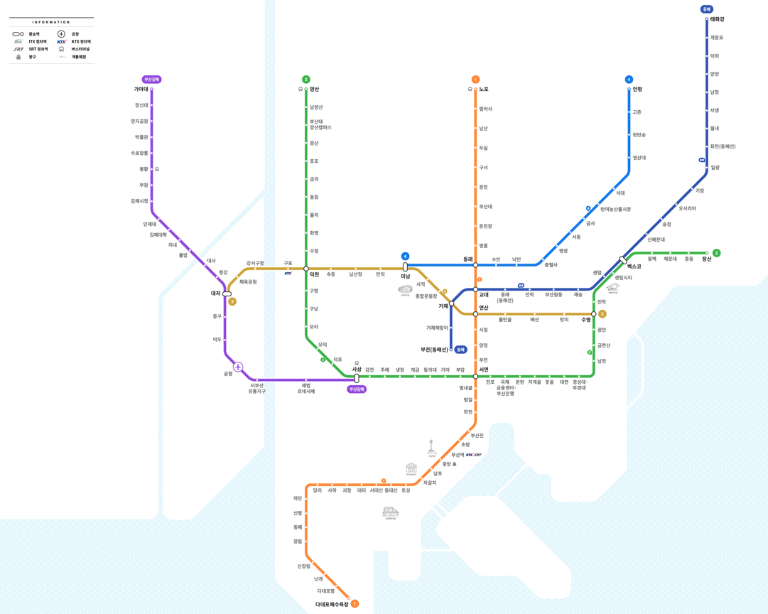 ✅️ 부산 지하철은 1호선부터 4호선까지 총 4개의 도시철도 노선과 부산김해경전철, 동해선을 포함하여 시내는 물론 김해, 양산 등 인접 지역까지 빠르게 연결해주는 교통망입니다.