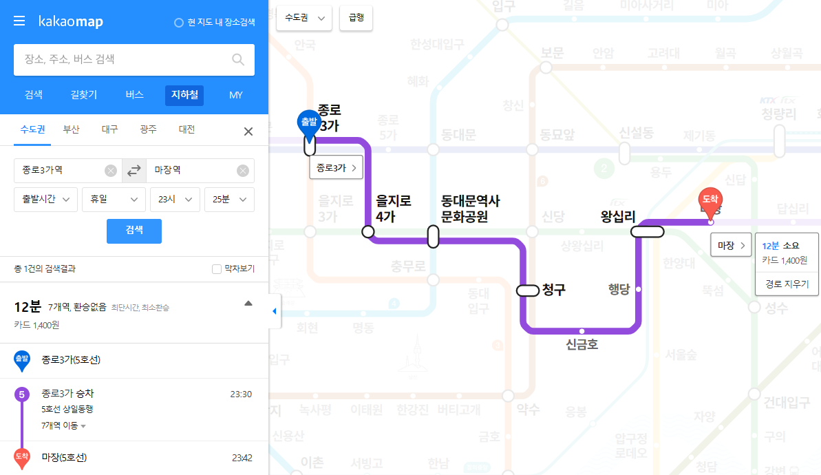 2️⃣ 출발역과 도착역을 입력하고 검색합니다.