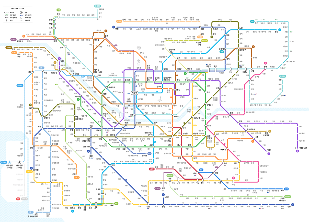 📌 서울 지하철은 1호선부터 9호선까지 편하게 이동할수 있도록 서로 연결되어 있으며, 여기에 공항철도, 신분당선, 경의중앙선 등 여러 연장 노선이 더해져 수도권까지 이어지는 대표적인 대중교통망입니다.