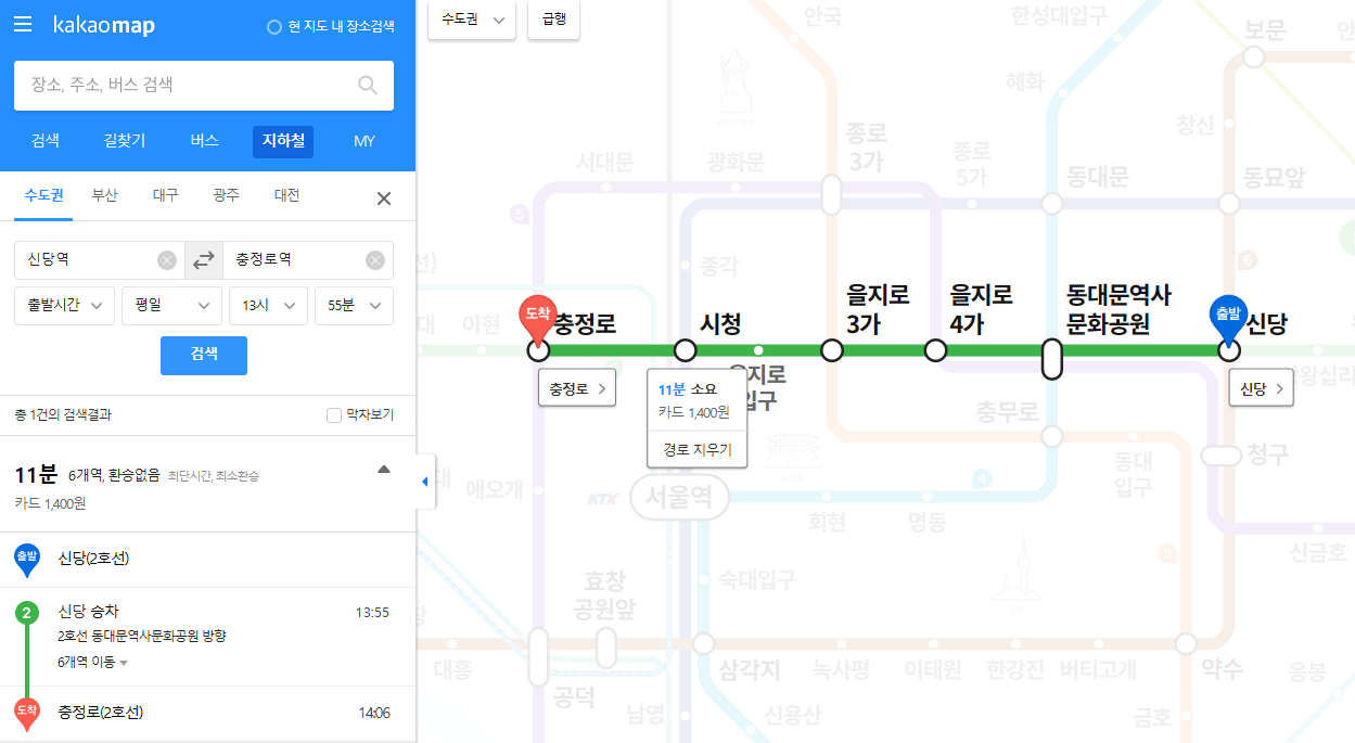 2️⃣ 구간에 대한 첫차·막차 시간, 열차 도착 예정 시각, 소요 시간, 요금, 환승 정보까지 한 화면에 확인할 수 있습니다.