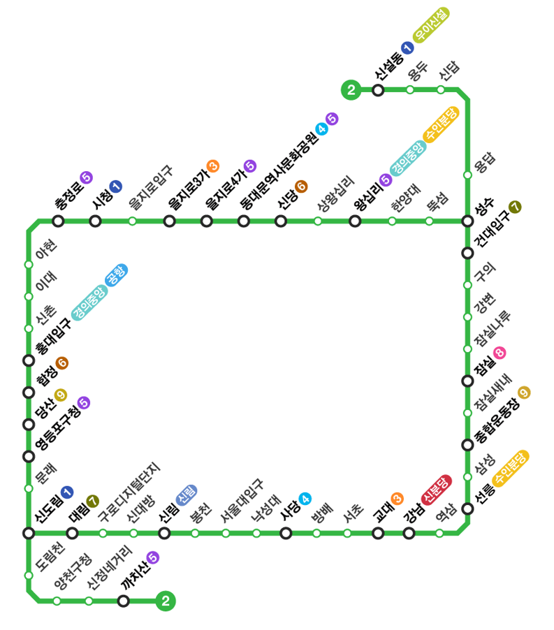 - 시청 – 을지로입구 – 강남 – 삼성 – 잠실 – 신도림 – 서울대입구 – 홍대입구 – 을지로입구 순으로 순환