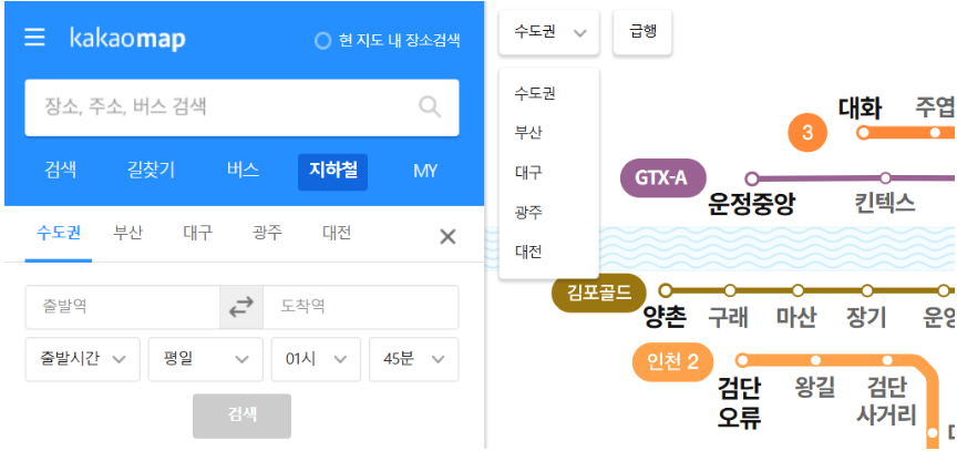 2️⃣ 다음 페이지에서 수도권을 선택한 후, 출발역과 도착역을 입력합니다.