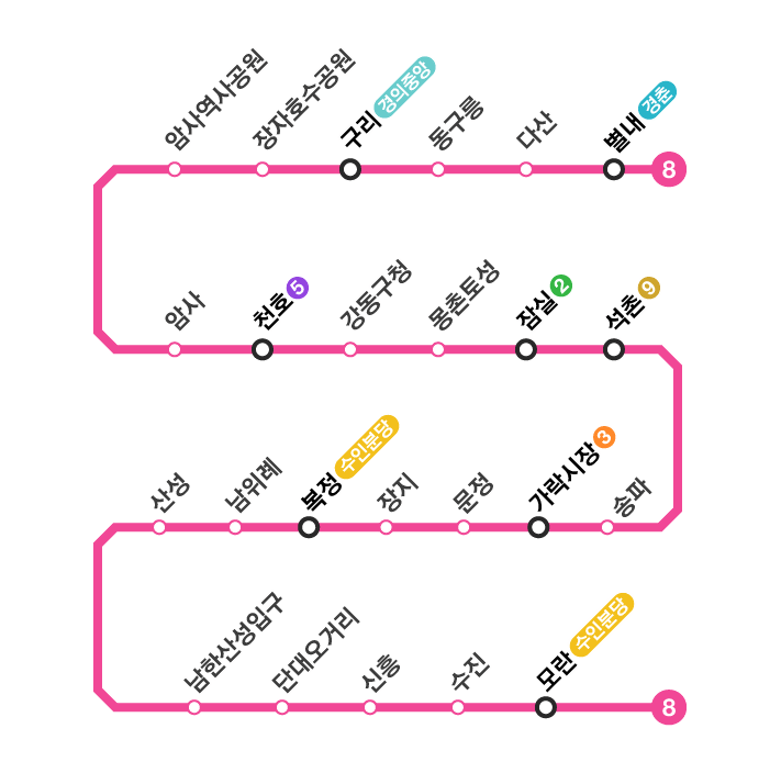 📌 서울 지하철 8호선은 경기도 성남시의 모란역에서 시작해 별내역까지 이어지는 동남권 중심 노선입니다.