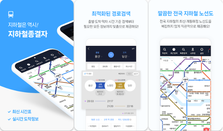 가장 많이 쓰이는 앱 중 하나인 ‘지하철종결자’는 전국 주요 도시 지하철의 열차 위치와 도착 예정 시간을 빠르게 보여줍니다.