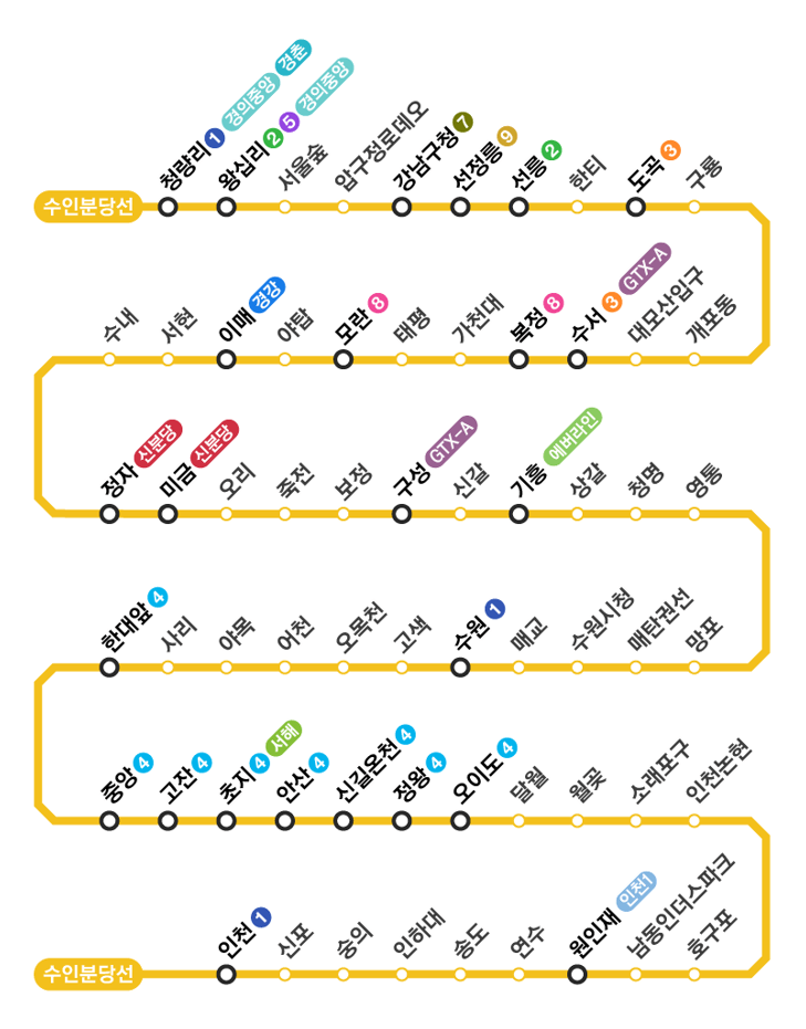 ✅ 수인분당선은 서울에서 인천과 수원, 안산을 연결하는 광역철도 노선으로, 수도권 남부 지역의 이동을 빠르게 도와주는 주요 교통망 중 하나입니다.