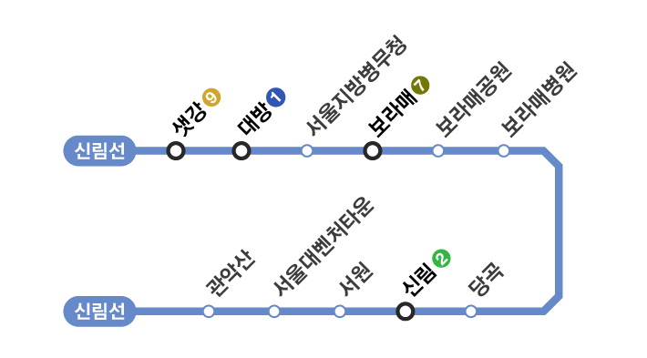 - 샛강역 (9호선 환승) → 대방역 (1호선 환승) → 서울지방병무청역 → 보라매역 → 보라매공원 → 보라매병원역 → 당곡역 → 신림역 → 서원역 → 서울대벤처타운역 → 관악산역