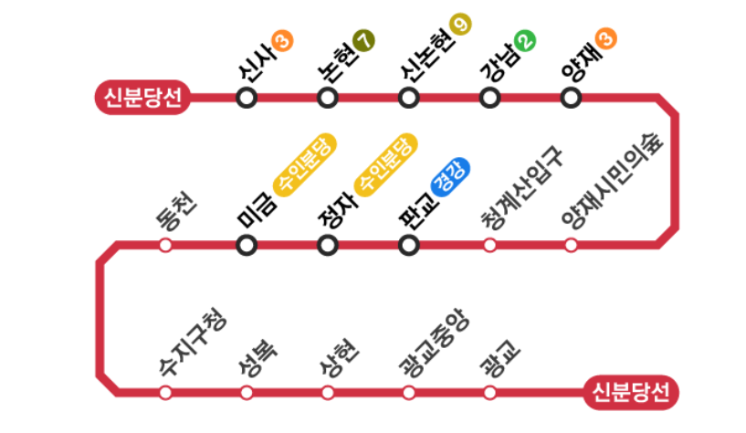 📌 신분당선은 서울 신사에서 출발해 강남, 양재, 판교, 광교 등 수도권 남부 핵심 지역을 빠르게 잇는 노선입니다.