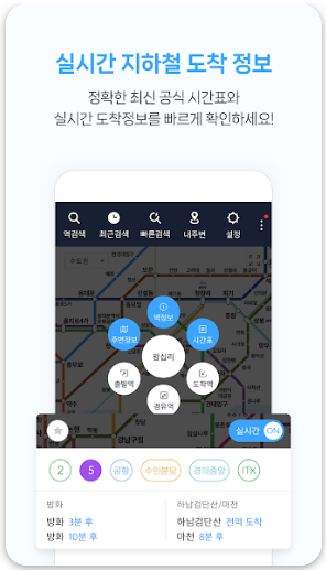 위치 기반으로 제공되기 때문에 현재 위치에서 가장 가까운 역 기준 도착 예정시간도 바로 확인 가능하죠.