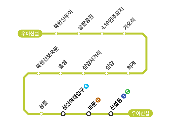 - 북한산우이역 → 솔밭공원역 → 4.19민주묘지역 → 가오리역 → 화계역 → 삼양역 → 삼양사거리역 → 솔샘역 → 북한산보국문역 → 정릉역 → 성신여대입구역 → 보문역 → 신설동역